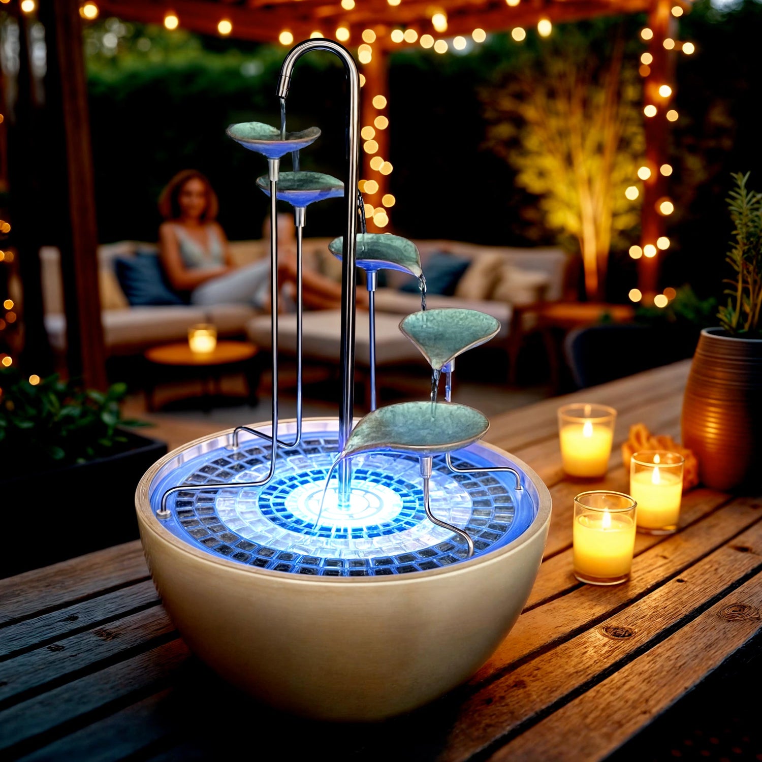 The award-winning Hydria Leaf Cascade showcases a delicate tiered leaf design and a refined stainless-steel fount at its center, offering the gentle murmur of cascading water with a tender, captivating flow. Soft lighting weaves a calming ambiance, nurturing wellness, while the decorative glass mosaic inlay dances with daylight against the water’s cascade by day and glows with the inlaid lighting’s charm at night, gently shaping it into a captivating centerpiece for any setting.